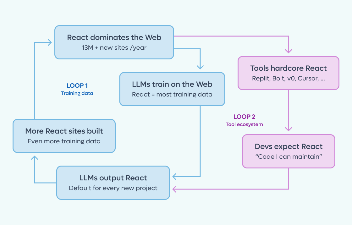 The mechanism is a double feedback loop. First: React dominates the existing web, LLMs train on the existing web, LLMs output React by default, new sites use React, and there's even more React for future training. Second: developer tools like Replit, Bolt, and similar products don't just passively reflect this: they hardcode React into their system prompts because that's what developers expect and can maintain.