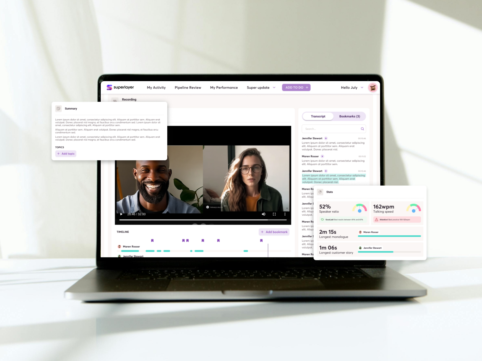 Our collaboration with Superlayer resulted in a powerful Conversation Intelligence module that empowers sales teams to better understand their customers and optimize their sales processes. The feature assists Superlayer’s customers in reducing the time spent reviewing sales calls and helps them achieve increased efficiency with faster ramp-up times and higher win rates.